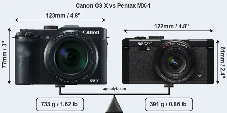The physical size and weight of the Canon G3 X and the Pentax MX-1 are illustrated in the side-by-side display below. The two cameras are presented according to their relative size. Three consecutive perspectives from the front, the top, and the back are available. All width, height and depth dimensions are rounded to the nearest millimeter.