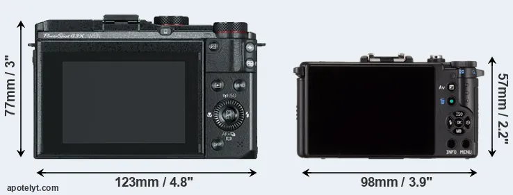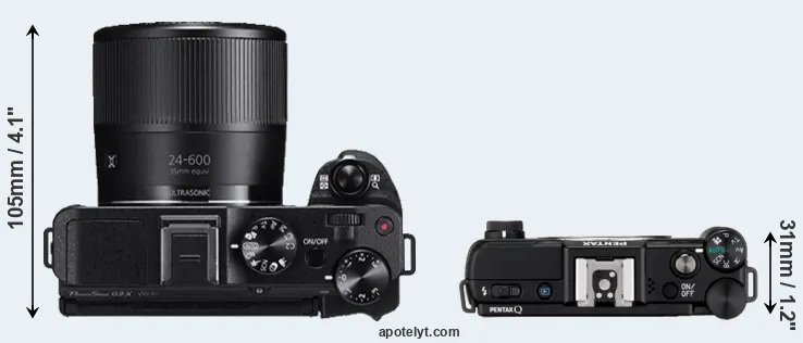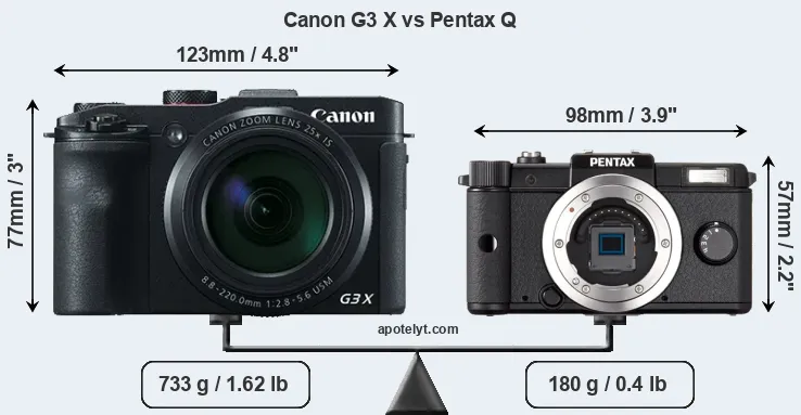 The side-by-side display below illustrates the physical size and weight of the Canon G3 X and the Pentax Q. The two cameras are presented according to their relative size. Three consecutive perspectives from the front, the top, and the back are available. All width, height and depth measures are rounded to the nearest millimeter.