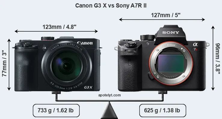 An illustration of the physical size and weight of the Canon G3 X and the Sony A7R II is provided in the side-by-side display below. The two cameras are presented according to their relative size. Three successive views from the front, the top, and the rear are shown. All width, height and depth dimensions are rounded to the nearest millimeter.