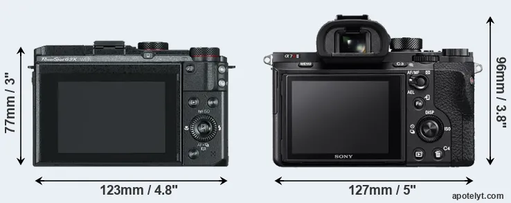 If the front view area (width x height) of the cameras is taken as an aggregate measure of their size, the Sony A7R II is notably larger (29 percent) than the Canon G3 X. In this context, it is worth noting that both cameras are splash and dust-proof and can, hence, be used in inclement weather conditions or harsh environments.