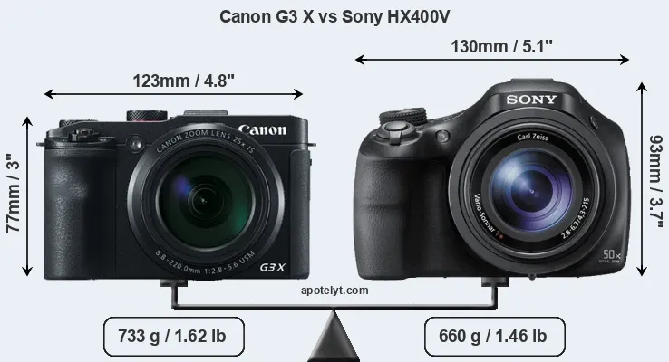 If the front view area (width x height) of the cameras is taken as an aggregate measure of their size, the Sony HX400V is notably larger (28 percent) than the Canon G3 X. However, the HX400V is markedly lighter (10 percent) than the G3X. It is worth mentioning in this context that the G3X is splash and dust resistant, while the HX400V does not feature any corresponding weather-sealing.