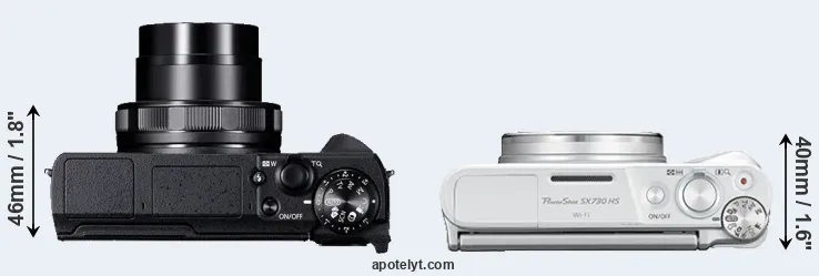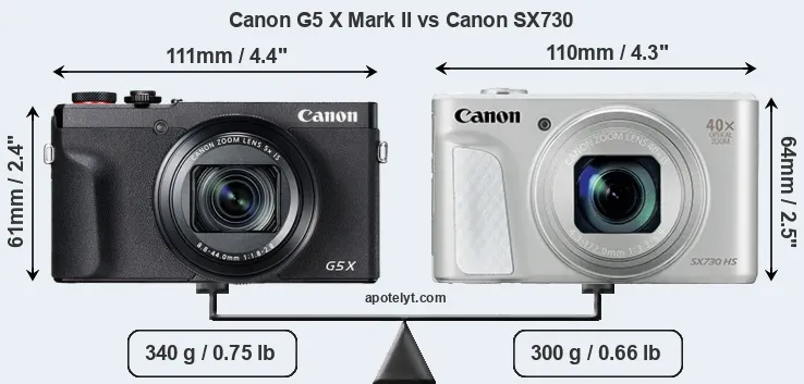 The side-by-side display below illustrates the physical size and weight of the Canon G5 X Mark II and the Canon SX730. The two cameras are presented according to their relative size. Three consecutive perspectives from the front, the top, and the back are available. All width, height and depth measures are rounded to the nearest millimeter.