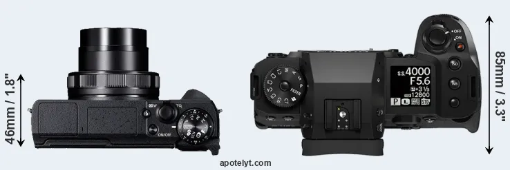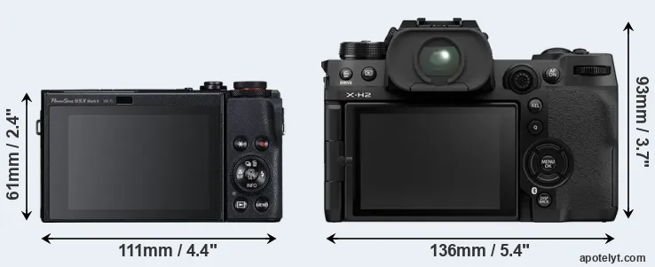 If the front view area (width x height) of the cameras is taken as an aggregate measure of their size, the Fujifilm X-H2 is considerably larger (87 percent) than the Canon G5 X Mark II. It is noteworthy in this context that the X-H2 is splash and dust-proof, while the G5X Mark II does not feature any corresponding weather-sealing.