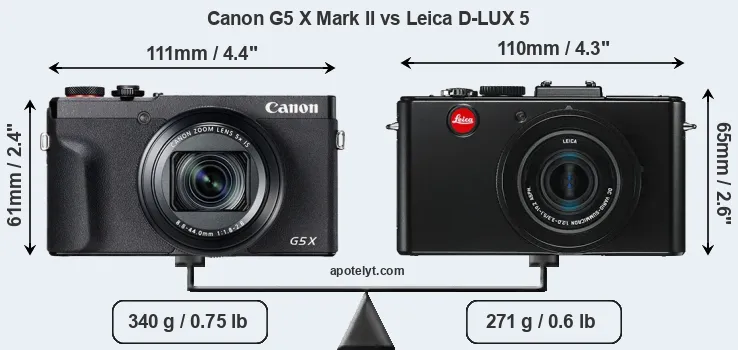 An illustration of the physical size and weight of the Canon G5 X Mark II and the Leica D-LUX 5 is provided in the side-by-side display below. The two cameras are presented according to their relative size. Three consecutive perspectives from the front, the top, and the back are available. All width, height and depth measures are rounded to the nearest millimeter.