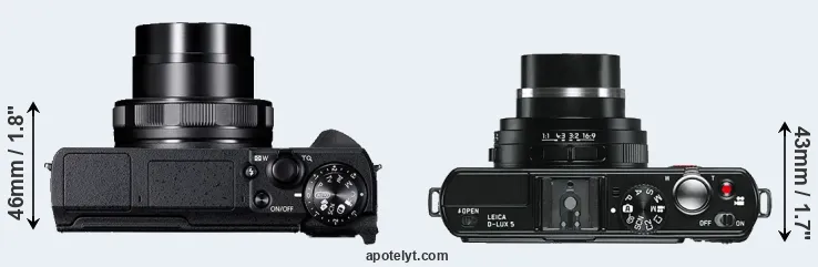 If the front view area (width x height) of the cameras is taken as an aggregate measure of their size, the Leica D-LUX 5 is notably larger (6 percent) than the Canon G5 X Mark II. However, the D-LUX 5 is markedly lighter (20 percent) than the G5X Mark II. In this context, it is worth noting that neither the G5X Mark II nor the D-LUX 5 are weather-sealed.