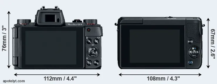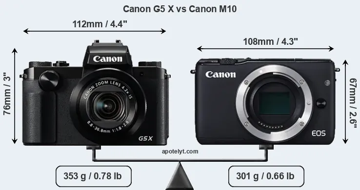 The side-by-side display below illustrates the physical size and weight of the Canon G5 X and the Canon M10. The two cameras are presented according to their relative size. Three successive views from the front, the top, and the rear are shown. All size dimensions are rounded to the nearest millimeter.