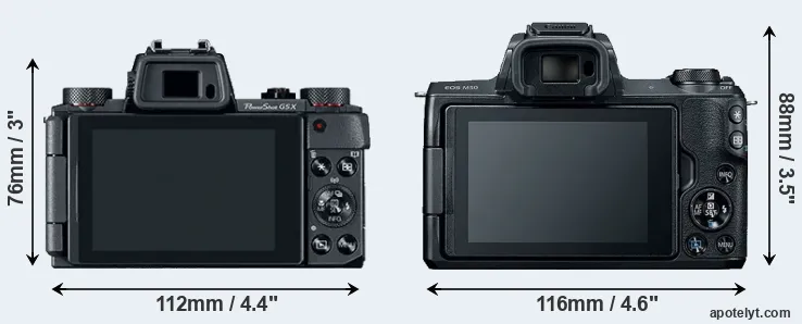 If the front view area (width x height) of the cameras is taken as an aggregate measure of their size, the Canon M50 is notably larger (20 percent) than the Canon G5 X. In this context, it is worth noting that neither the G5X nor the M50 are weather-sealed.