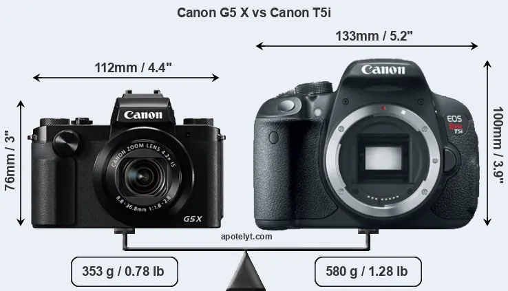 The above size and weight comparisons are to some extent incomplete and possibly misleading, as the G5X has a lens built in, whereas the T5i is an interchangeable lens camera that requires a separate lens. Attaching the latter will add extra weight and bulk to the setup. You can compare the optics available for the T5i and their specifications in the Canon EF Lens Catalog.