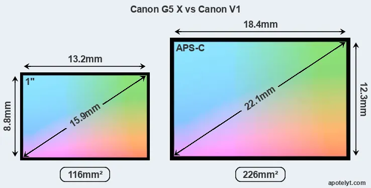 Of the two cameras under consideration, the Canon G5 X features an one-inch sensor and the Canon V1 an APS-C sensor. The sensor area in the V1 is 95 percent bigger. As a result of these sensor size differences, the cameras have a format factor of, respectively, 2.7 and 1.6. Both cameras have a native aspect ratio (sensor width to sensor height) of 3:2.