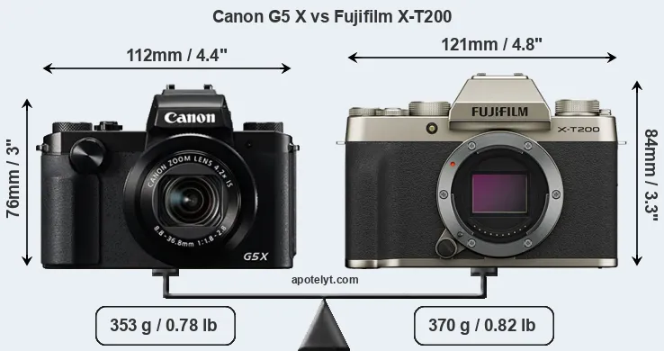 An illustration of the physical size and weight of the Canon G5 X and the Fujifilm X-T200 is provided in the side-by-side display below. The two cameras are presented according to their relative size. Three successive views from the front, the top, and the rear are shown. All size dimensions are rounded to the nearest millimeter.