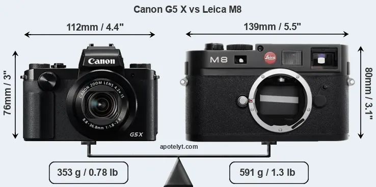 If the front view area (width x height) of the cameras is taken as an aggregate measure of their size, the Leica M8 is notably larger (31 percent) than the Canon G5 X. In this context, it is worth noting that neither the G5X nor the M8 are weather-sealed.