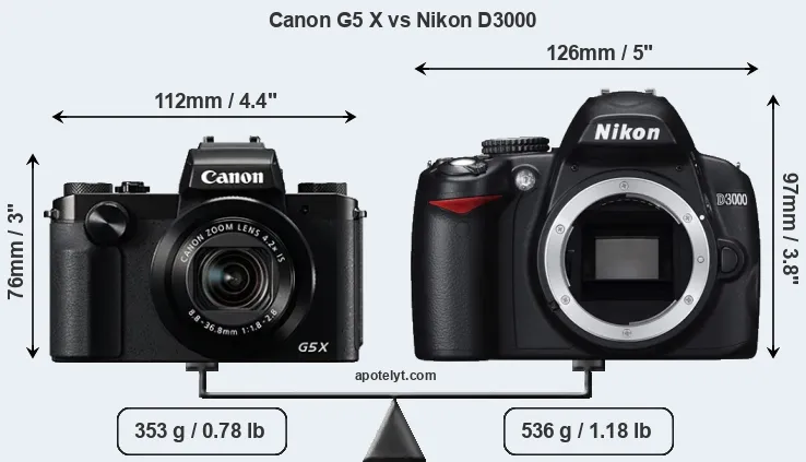 An illustration of the physical size and weight of the Canon G5 X and the Nikon D3000 is provided in the side-by-side display below. The two cameras are presented according to their relative size. Three consecutive views from the front, the top, and the rear side are shown. All width, height and depth measures are rounded to the nearest millimeter.