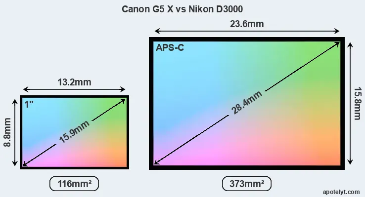 Of the two cameras under consideration, the Canon G5 X features an one-inch sensor and the Nikon D3000 an APS-C sensor. The sensor area in the D3000 is 222 percent bigger. As a result of these sensor size differences, the cameras have a format factor of, respectively, 2.7 and 1.5. Both cameras have a native aspect ratio (sensor width to sensor height) of 3:2.