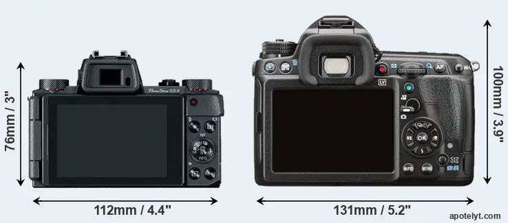 If the front view area (width x height) of the cameras is taken as an aggregate measure of their size, the Pentax K-3 II is considerably larger (54 percent) than the Canon G5 X. It is noteworthy in this context that the K-3 II is splash and dust-proof, while the G5X does not feature any corresponding weather-sealing.