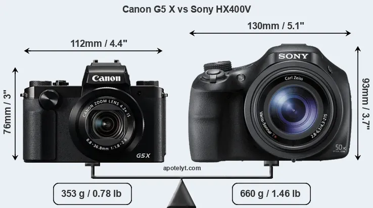 The side-by-side display below illustrates the physical size and weight of the Canon G5 X and the Sony HX400V. The two cameras are presented according to their relative size. Three successive views from the front, the top, and the rear are shown. All width, height and depth dimensions are rounded to the nearest millimeter.