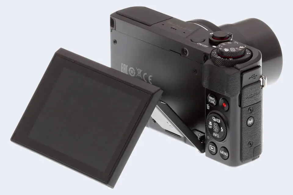 The LCD screen on the Canon PowerShot G7 X Mark II is flexibly attached to the body. In particular, the LCD can be tilted vertically to facilitate odd-angle shots in landscape orientation. This tilting design is often preferred, for example, by street photographers to a fully articulated, swivel type of LCD attachment, as it is more unobtrusive during shooting than a screen that flips out to the side.
