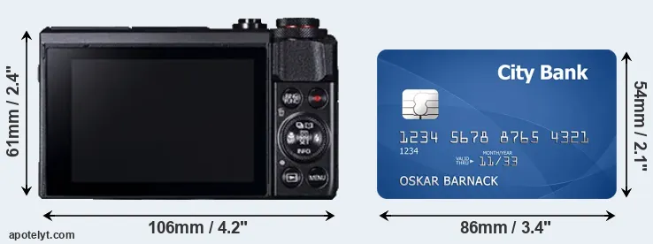 The physical dimensions of the Canon G7 X Mark II relative to a credit card are illustrated in the side-by-side display below. Three successive views from the front, the top, and the rear are shown. All width, height and depth measures are rounded to the nearest millimeter.