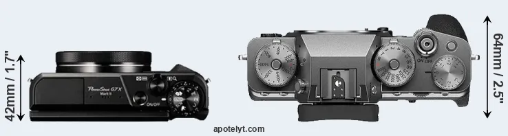 If the front view area (width x height) of the cameras is taken as an aggregate measure of their size, the Fujifilm X-T4 is considerably larger (94 percent) than the Canon G7 X Mark II. It is noteworthy in this context that the X-T4 is splash and dust-proof, while the G7X Mark II does not feature any corresponding weather-sealing.