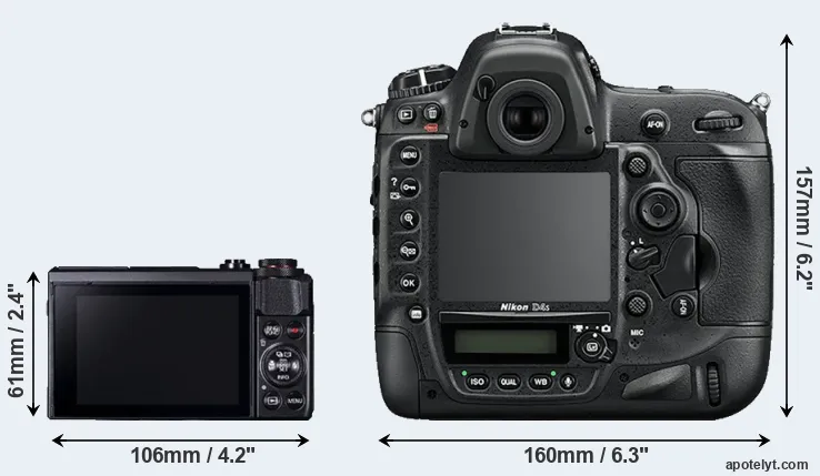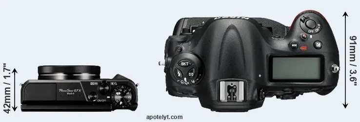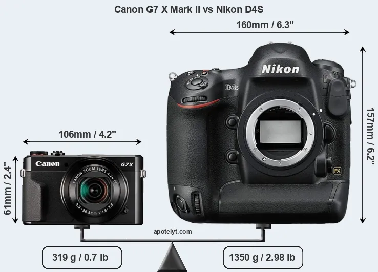 The side-by-side display below illustrates the physical size and weight of the Canon G7 X Mark II and the Nikon D4S. The two cameras are presented according to their relative size. Three consecutive perspectives from the front, the top, and the back are available. All size dimensions are rounded to the nearest millimeter.
