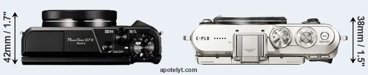 The above size and weight comparisons are to some extent incomplete and possibly misleading, as the G7X Mark II has a lens built in, whereas the E-PL8 is an interchangeable lens camera that requires a separate lens. Attaching the latter will add extra weight and bulk to the setup. You can compare the optics available for the E-PL8 and their specifications in the Micro Four Thirds Lens Catalog.