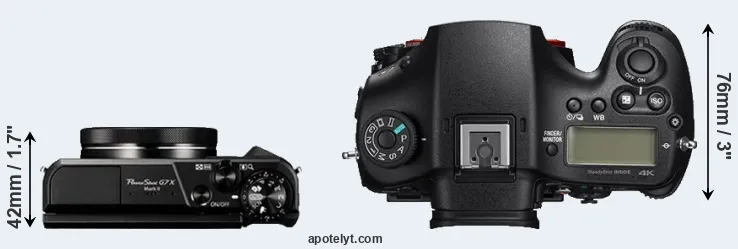 The side-by-side display below illustrates the physical size and weight of the Canon G7 X Mark II and the Sony A99 II. The two cameras are presented according to their relative size. Three consecutive perspectives from the front, the top, and the back are available. All width, height and depth measures are rounded to the nearest millimeter.