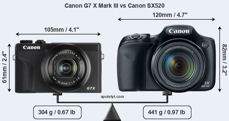 If the front view area (width x height) of the cameras is taken as an aggregate measure of their size, the Canon SX520 is considerably larger (54 percent) than the Canon G7 X Mark III. Moreover, the SX520 is substantially heavier (45 percent) than the G7X Mark III. In this context, it is worth noting that neither the G7X Mark III nor the SX520 are weather-sealed.