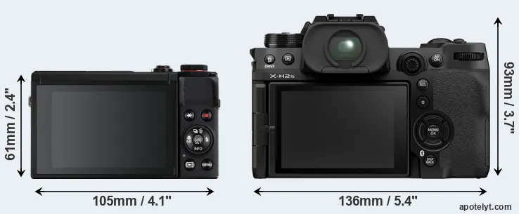 If the front view area (width x height) of the cameras is taken as an aggregate measure of their size, the Fujifilm X-H2S is considerably larger (97 percent) than the Canon G7 X Mark III. It is noteworthy in this context that the X-H2S is splash and dust-proof, while the G7X Mark III does not feature any corresponding weather-sealing.