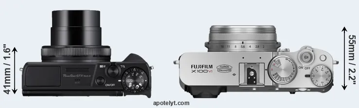 The side-by-side display below illustrates the physical size and weight of the Canon G7 X Mark III and the Fujifilm X100VI. The two cameras are presented according to their relative size. Three consecutive perspectives from the front, the top, and the back are available. All width, height and depth measures are rounded to the nearest millimeter.