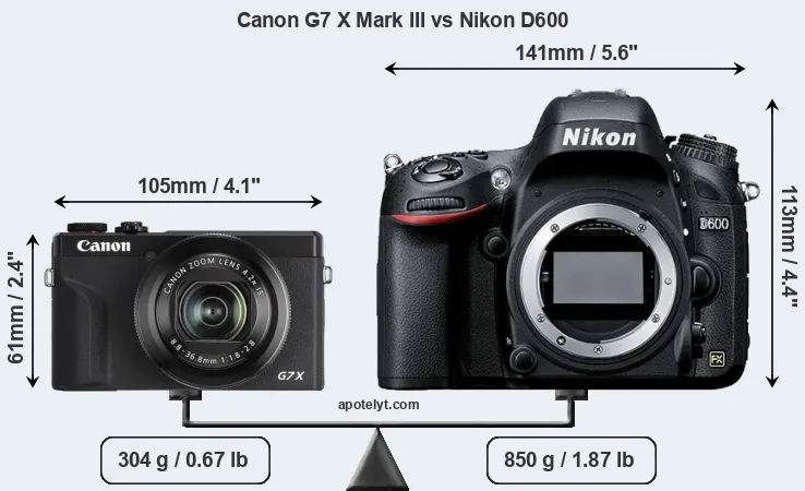 The side-by-side display below illustrates the physical size and weight of the Canon G7 X Mark III and the Nikon D600. The two cameras are presented according to their relative size. Three consecutive perspectives from the front, the top, and the back are available. All width, height and depth dimensions are rounded to the nearest millimeter.