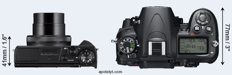 The above size and weight comparisons are to some extent incomplete and possibly misleading, as the G7X Mark III has a lens built in, whereas the D7000 is an interchangeable lens camera that requires a separate lens. Attaching the latter will add extra weight and bulk to the setup. You can compare the optics available for the D7000 and their specifications in the Nikon Lens Catalog.
