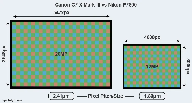 With 20MP, the G7X Mark III offers a higher resolution than the P7800 (12MP), but the G7X Mark III nevertheless has larger individual pixels (pixel pitch of 2.41μm versus 1.89μm for the P7800) due to its larger sensor. Moreover, the G7X Mark III is a much more recent model (by 5 years and 10 months) than the P7800, and its sensor will have benefitted from technological advances during this time that further enhance the light gathering capacity of its pixels.