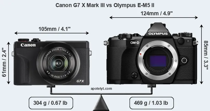 The side-by-side display below illustrates the physical size and weight of the Canon G7 X Mark III and the Olympus E-M5 II. The two cameras are presented according to their relative size. Three consecutive perspectives from the front, the top, and the back are available. All width, height and depth measures are rounded to the nearest millimeter.