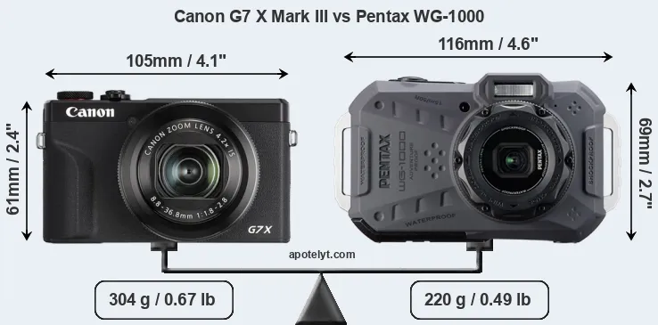 If the front view area (width x height) of the cameras is taken as an aggregate measure of their size, the Pentax WG-1000 is notably larger (25 percent) than the Canon G7 X Mark III. However, the WG-1000 is markedly lighter (28 percent) than the G7X Mark III. It is noteworthy in this context that the WG-1000 is splash and dust-proof, while the G7X Mark III does not feature any corresponding weather-sealing. More than that, the WG-1000 is water-proof up to 15m and can, thus, be used for underwater photography.