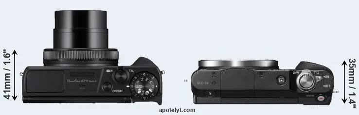 The above size and weight comparisons are to some extent incomplete and possibly misleading, as the G7X Mark III has a lens built in, whereas the NEX-3N is an interchangeable lens camera that requires a separate lens. Attaching the latter will add extra weight and bulk to the setup. You can compare the optics available for the NEX-3N and their specifications in the Sony E-Mount Lens Catalog.
