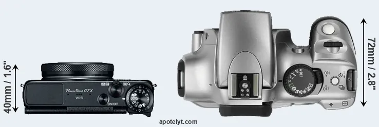 The side-by-side display below illustrates the physical size and weight of the Canon G7 X and the Canon Rebel. The two cameras are presented according to their relative size. Three consecutive perspectives from the front, the top, and the back are available. All width, height and depth measures are rounded to the nearest millimeter.