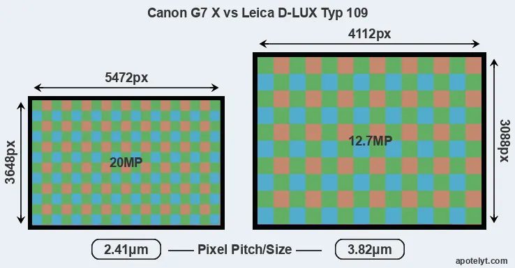 Despite having a smaller sensor, the Canon G7 X offers a higher resolution of 20 megapixels, compared with 12.7 MP of the Leica D-LUX Typ 109. This megapixels advantage comes at the cost of a higher pixel density and a smaller size of the individual pixel (with a pixel pitch of 2.41μm versus 3.82μm for the D-LUX Typ 109). It is noteworthy in this context that the two cameras were released in close succession, so that their sensors are from the same technological generation.