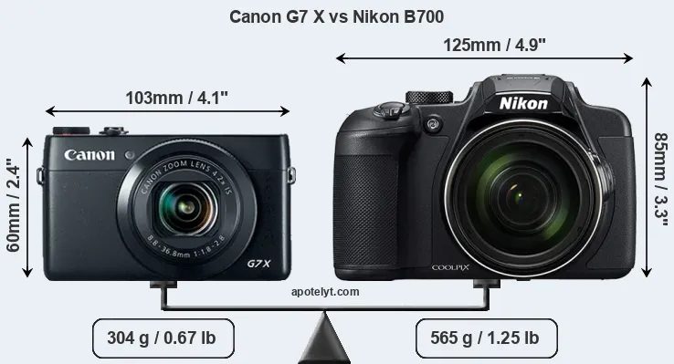 The side-by-side display below illustrates the physical size and weight of the Canon G7 X and the Nikon B700. The two cameras are presented according to their relative size. Three consecutive perspectives from the front, the top, and the back are available. All width, height and depth measures are rounded to the nearest millimeter.