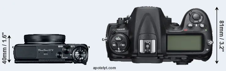 If the front view area (width x height) of the cameras is taken as an aggregate measure of their size, the Nikon D300S is considerably larger (174 percent) than the Canon G7 X. It is noteworthy in this context that the D300S is splash and dust-proof, while the G7X does not feature any corresponding weather-sealing.