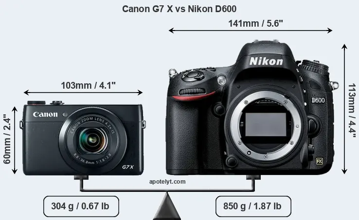 An illustration of the physical size and weight of the Canon G7 X and the Nikon D600 is provided in the side-by-side display below. The two cameras are presented according to their relative size. Three consecutive perspectives from the front, the top, and the back are available. All width, height and depth measures are rounded to the nearest millimeter.