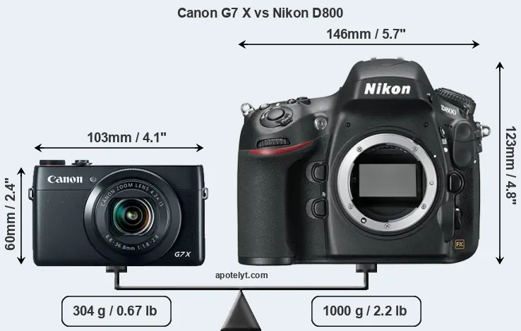 An illustration of the physical size and weight of the Canon G7 X and the Nikon D800 is provided in the side-by-side display below. The two cameras are presented according to their relative size. Three consecutive views from the front, the top, and the rear side are shown. All size dimensions are rounded to the nearest millimeter.
