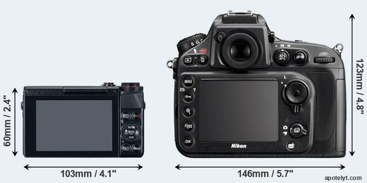 The above size and weight comparisons are to some extent incomplete and possibly misleading, as the G7X has a lens built in, whereas the D800 is an interchangeable lens camera that requires a separate lens. Attaching the latter will add extra weight and bulk to the setup. You can compare the optics available for the D800 and their specifications in the Nikon Lens Catalog.