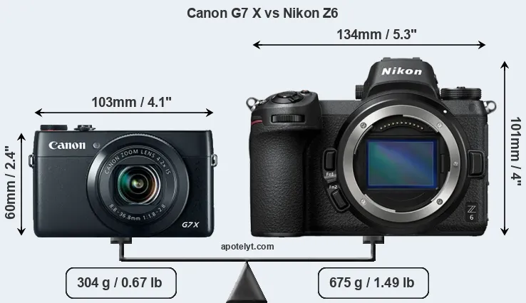 The side-by-side display below illustrates the physical size and weight of the Canon G7 X and the Nikon Z6. The two cameras are presented according to their relative size. Three consecutive perspectives from the front, the top, and the back are available. All width, height and depth measures are rounded to the nearest millimeter.