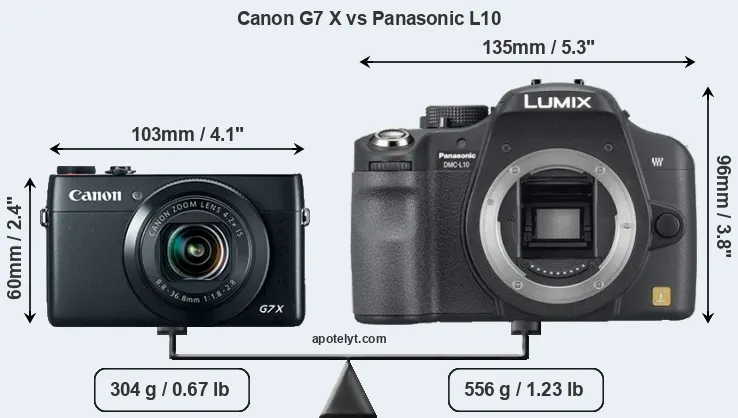 The physical size and weight of the Canon G7 X and the Panasonic L10 are illustrated in the side-by-side display below. The two cameras are presented according to their relative size. Three consecutive perspectives from the front, the top, and the back are available. All width, height and depth dimensions are rounded to the nearest millimeter.