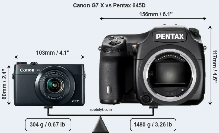 An illustration of the physical size and weight of the Canon G7 X and the Pentax 645D is provided in the side-by-side display below. The two cameras are presented according to their relative size. Three successive views from the front, the top, and the rear are shown. All size dimensions are rounded to the nearest millimeter.