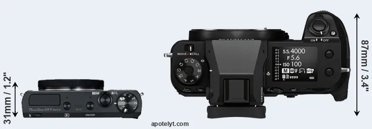 An illustration of the physical size and weight of the Canon G9 X Mark II and the Fujifilm GFX 100S is provided in the side-by-side display below. The two cameras are presented according to their relative size. Three successive views from the front, the top, and the rear are shown. All width, height and depth dimensions are rounded to the nearest millimeter.