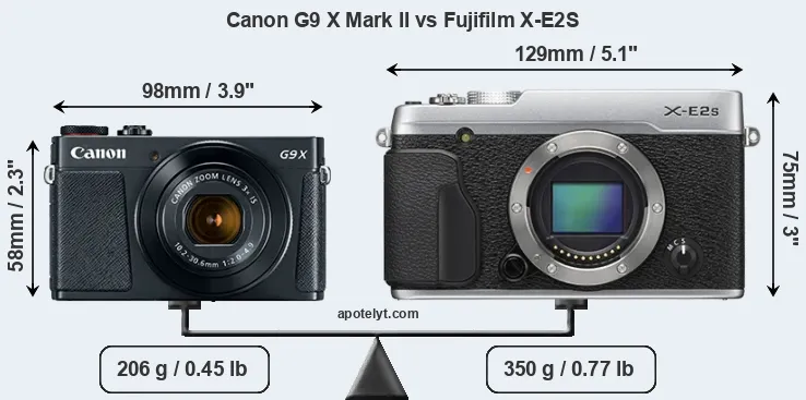 The side-by-side display below illustrates the physical size and weight of the Canon G9 X Mark II and the Fujifilm X-E2S. The two cameras are presented according to their relative size. Three successive views from the front, the top, and the rear are shown. All width, height and depth measures are rounded to the nearest millimeter.