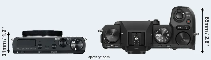 If the front view area (width x height) of the cameras is taken as an aggregate measure of their size, the Fujifilm X-S20 is considerably larger (91 percent) than the Canon G9 X Mark II. In this context, it is worth noting that neither the G9X Mark II nor the X-S20 are weather-sealed.