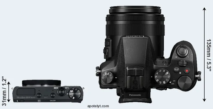 The side-by-side display below illustrates the physical size and weight of the Canon G9 X Mark II and the Panasonic FZ2500. The two cameras are presented according to their relative size. Three successive views from the front, the top, and the rear are shown. All width, height and depth measures are rounded to the nearest millimeter.