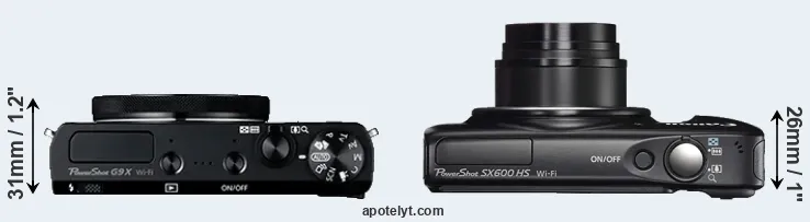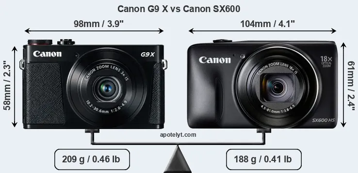 An illustration of the physical size and weight of the Canon G9 X and the Canon SX600 is provided in the side-by-side display below. The two cameras are presented according to their relative size. Three consecutive views from the front, the top, and the rear side are shown. All width, height and depth dimensions are rounded to the nearest millimeter.