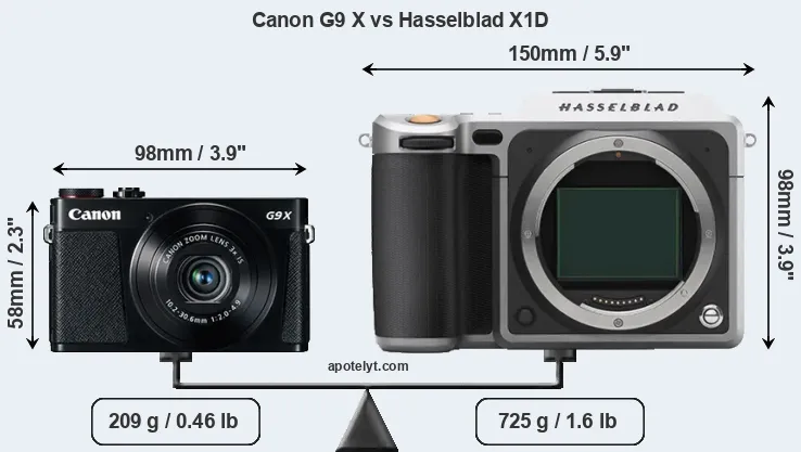 If the front view area (width x height) of the cameras is taken as an aggregate measure of their size, the Hasselblad X1D is considerably larger (159 percent) than the Canon G9 X. It is noteworthy in this context that the X1D is splash and dust-proof, while the G9X does not feature any corresponding weather-sealing.